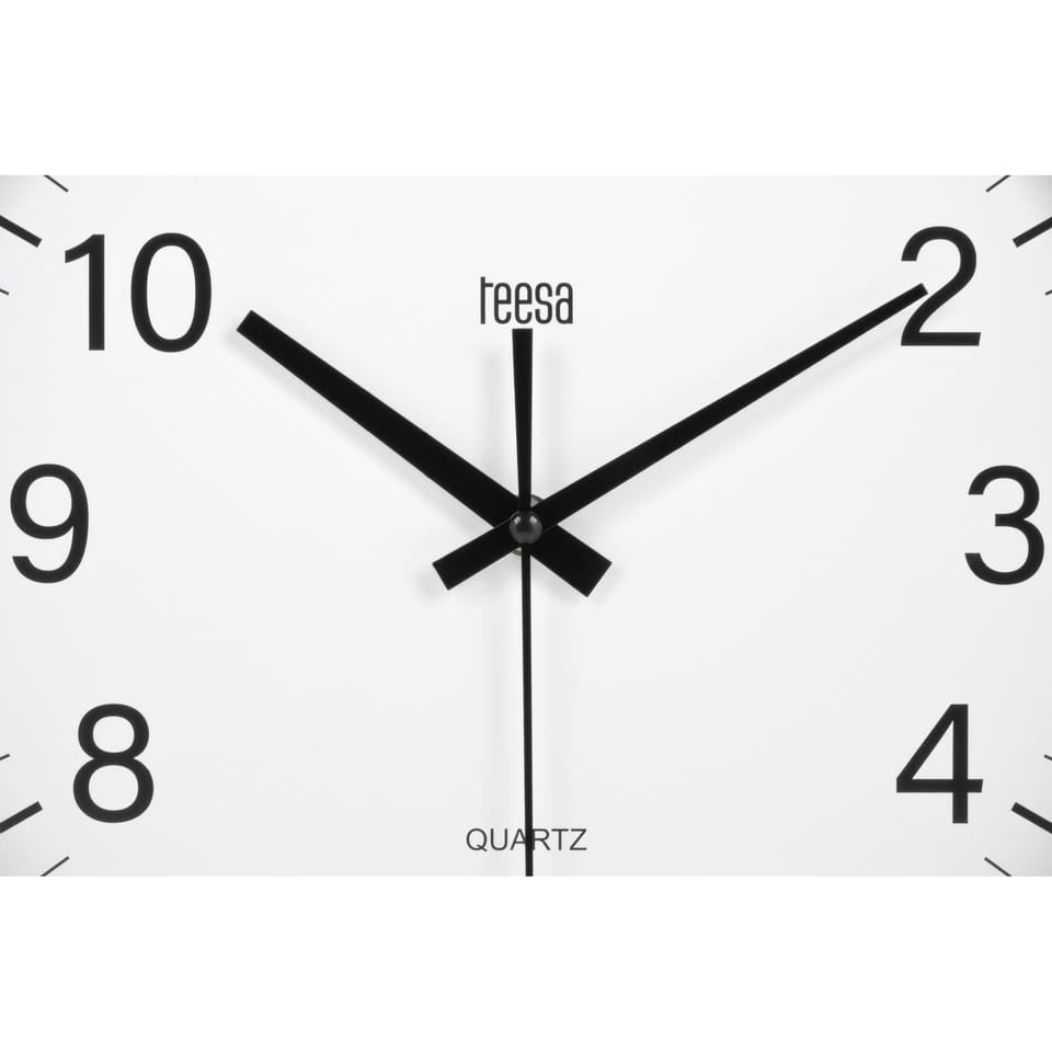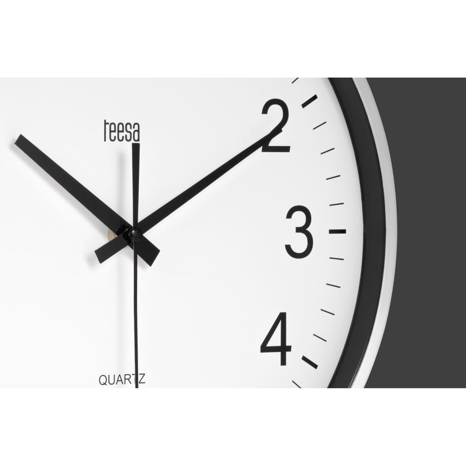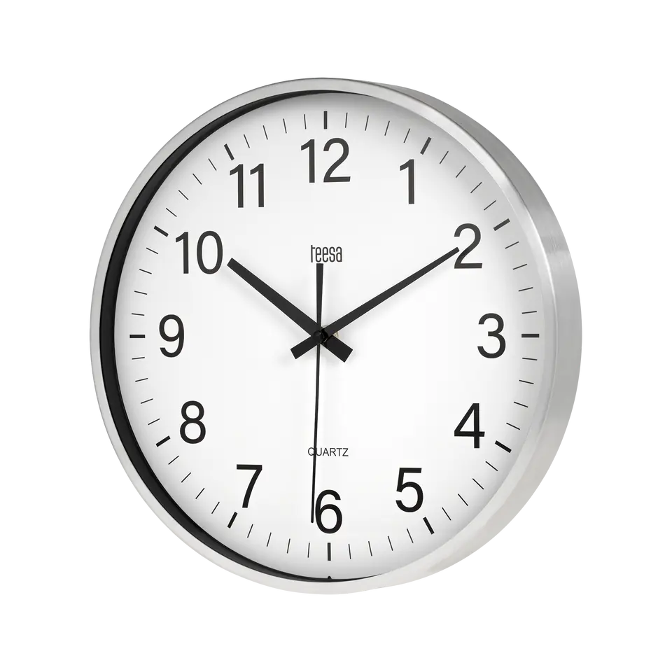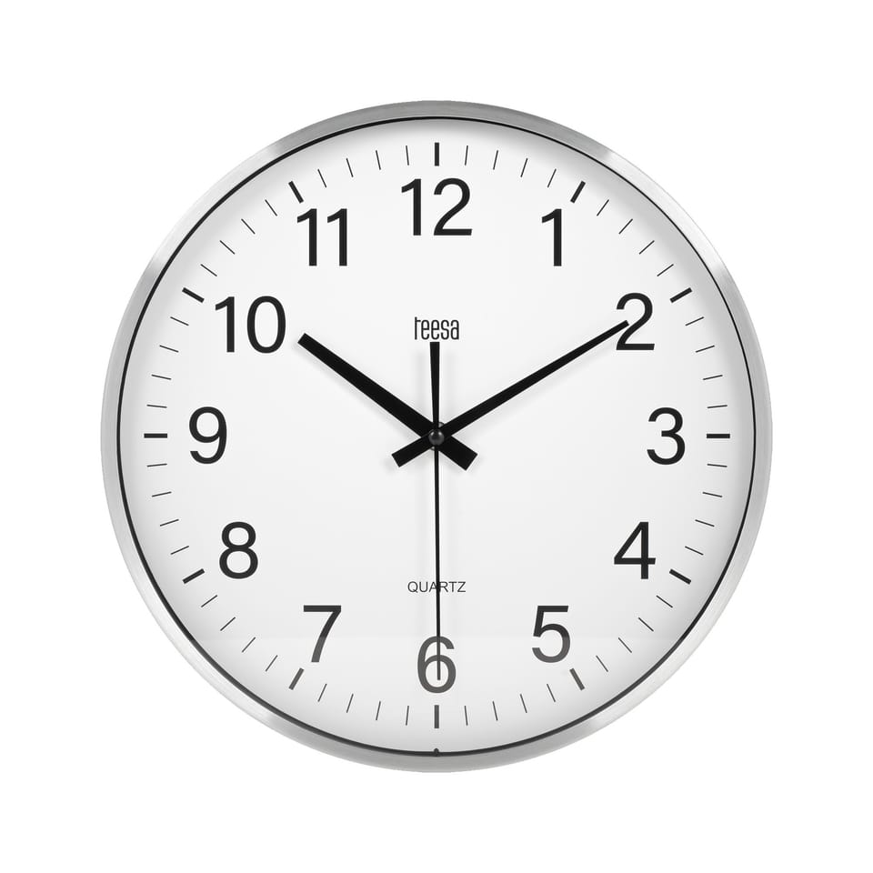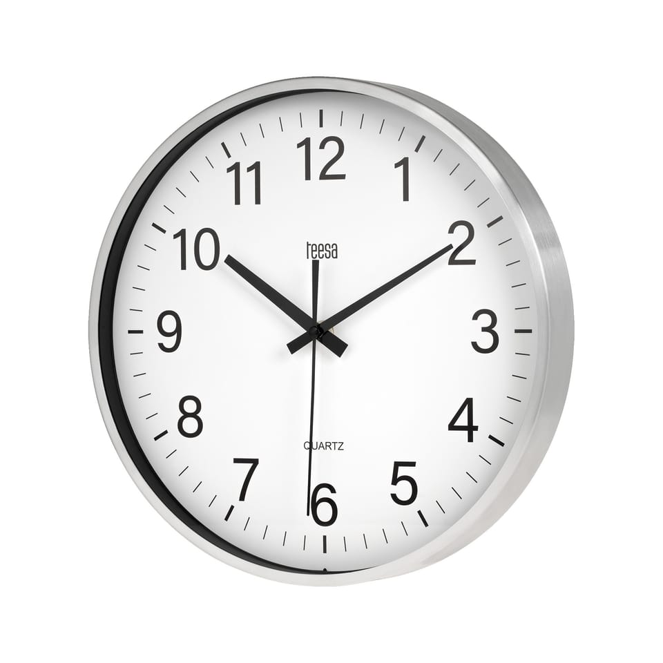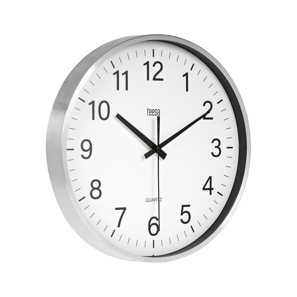 ----------GŁÓWNE CECHY----------Mechanizm kwarcowy z analogowym wyświetlaniem czasuBiała tarcza z cyframi arabskimiPłynny ruch sekundnikaOtwór do zawieszenia na ścianie----------DANE TECHNICZNE----------Materiał: aluminium, szkłoGłębokość: 4 cmŚrednica: 30 cmWaga: 534 gZasilanie: 1x bateria AA (brak w zestawie)