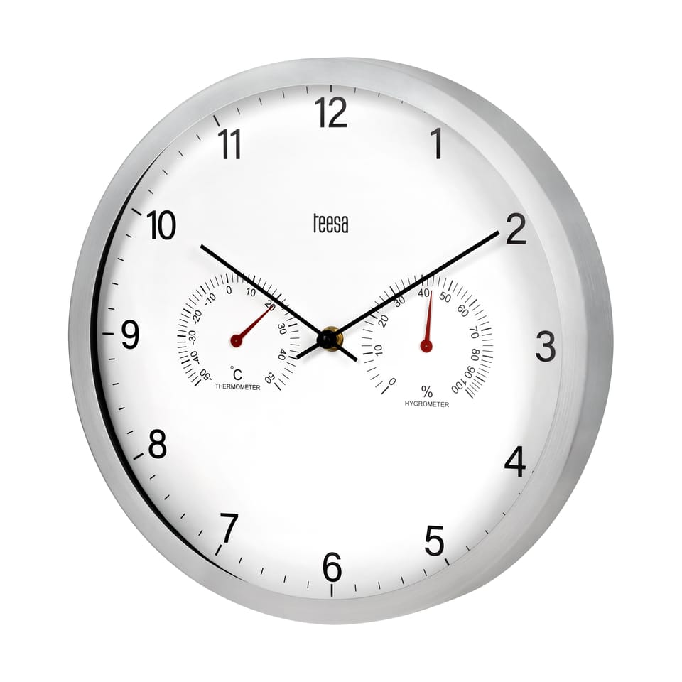 ----------GŁÓWNE CECHY----------Mechanizm kwarcowy z analogowym wyświetlaniem czasuBiała tarcza z cyframi arabskimiTermometr i higrometrOtwór do zawieszenia na ścianie----------DANE TECHNICZNE----------Materiał: aluminium, szkłoGłębokość: 4 cmŚrednica: 30 cmWaga: 596 gZasilanie: 1x bateria AA (brak w zestawie)