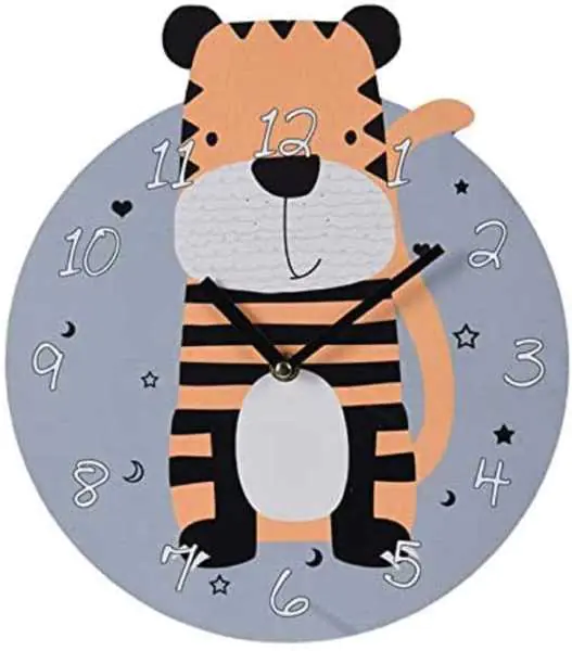 Zegar ścienny dla dzieci Tygrys 26 cm Zegar ścienny do pokoju dziecięcego z motywem tygrysa. Będzie idealny dla miłośników zwierząt. Zegar może być również świetnym pomysłem na prezent. Specyfikacja: Średnica: 26 cm Materiał: MDF Kolor: szary, pomarańczowy, czarny Zasilanie: 1xAA (brak w zestawie)