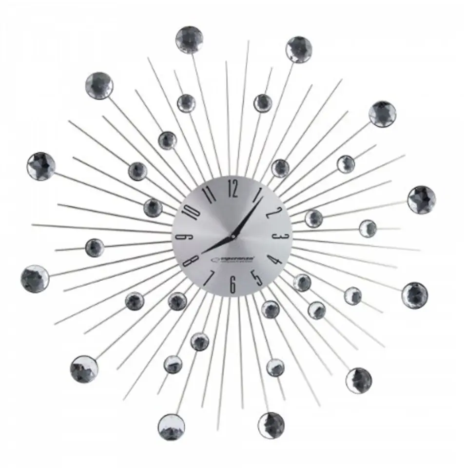 | Pozostałe cechy: | Średnica całego zegara: 50 cm, Średnica tarczy: 13.5 cm, Długość ozdobnych promieni: 35.5 cm, Grubość zegara: 2.5 cm, Ozdobne elementy wykonane ze stali, Kryształki w 2 rozmiarach: 2 cm oraz 3 cm, Kryształki wykonane z szkła akrylowego |