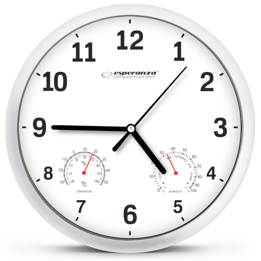 Nasz zegar ścienny Esperanza LYON służy nie tylko do pokazywania czasu - można na nim odczytać też temperaturę oraz wilgotność otoczenia. Jego wzornictwo sprawia, iż udekorujesz nim każde mieszkanie, biuro, sklep czy restaurację.