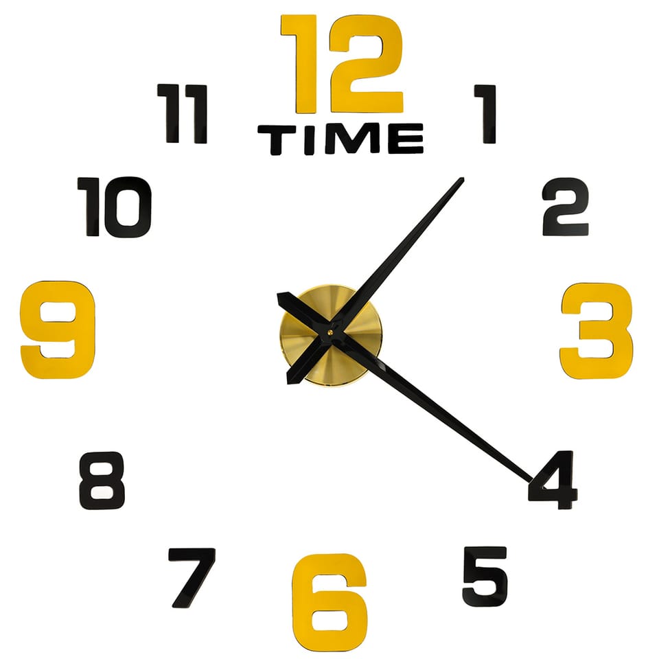 Cyfry zegara są w żółtym i czarnym kolorze, wskazówki są czarne, a podstawa zegara złota – dzięki czemu cały zestaw idealnie sprawdzi się jako nowoczesny akcent dodający Twojemu wnętrzu niepowtarzalnego klimatu.