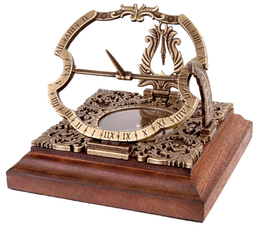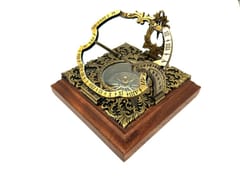Mosiężny zegar słoneczny Habsburg H30 - reprodukcja. Przepiękny, bogato zdobiony zegar słoneczny Habsbug. Na drewnianej podstawie. Wys. 10cm, szer. 10cm,. Uniwersalny zegar słoneczny orginalnie zbudowany w Niemczech, styl augsburski, model z XVIIIw. Opakowanie prezentowe: piękne, prezentowe pudełko z wypraką