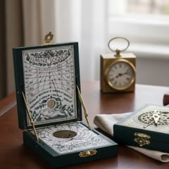 Zegar Słoneczny i Kompas Kepler - Dyptyk XVI/XVII Wieku, Replika Kolekcjonerska Ten elegancki zegar słoneczny Keplera to wierna replika historycznego dyptyku używanego w XVI i XVII wieku. Jest to funkcjonalny instrument, dzięki któremu można określić czas słoneczny, łączący w sobie piękno zabytkowego urządzenia z praktyczną funkcją nawigacyjną. Symbolika i Funkcjonalność • Precyzyjna Nawigacja: Zegar słoneczny z kompasem Kepler został zaprojektowany w celu usprawnienia nawigacji i określania kierunków. • Róża Wiatrów: Wyposażony jest w różę wiatrów, która wraz z igłą określa 32 różne kursy nawigacyjne. • Piękny Design: To pięknie zdobiony przedmiot, który zachwyca bogatą ornamentyką i dbałością o detale. Idealny Upominek Tematyczny Ten model to prawdziwa gratka dla kolekcjonerów zabytkowych urządzeń astronawigacyjnych. Jest idealnym upominkiem dla: • Żeglarza i entuzjasty podróży. • Astronoma (jako instrument historyczny). • Miłośnika historii i renesansowej techniki. Zegar słoneczny jest dostarczany w komplecie z pięknym, prezentowym pudełkiem z wypraską, gotowy do wręczenia. Informacje o Produkcie • Model: Dyptyk Kepler (Replika) • Materiał: Drewno, wklejka papierowa, mosiężny top (róża wiatrów) • Wymiary (zamknięty): 8,6 x 7 x 2 cm • W zestawie: Instrukcja obsługi w językach: angielskim, francuskim, włoskim i hiszpańskim • Waga: 125 g