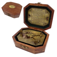 Zegar Słoneczny z Kompasem Retro – SUN-0106 Zegar Słoneczny z Kompasem Retro to przydatny gadżet dla miłośnika podróży i historycznych przyrządów nawigacyjnych. Na wewnętrznej części wieka pudełka znajduje się opis zegara w języku angielskim. Pudełko i zegar ośmiokątne. Zegar z kompasem wykonany głównie z mosiądzu. Pudełko drewniane. Zegar słoneczny z kompasem specyfikacja: ·Wymiary: 11,5 x 9,5 x 9 cm ·Materiał: mosiądz, szkło ·Kolory: dominanta złotego ·Napisy w języku angielskim ·Bogate zdobienia ·Ozdobny gnomon ·Cyfry rzymskie Pudełko: ·Materiał: drewno ·Tabliczka mosiężna na wewnętrznej części wieka z opisem ·Wymiary: 14 x 12 x 5 cm