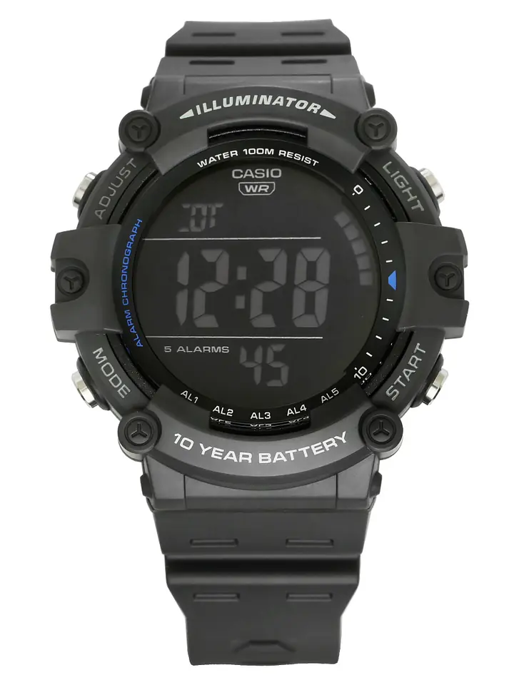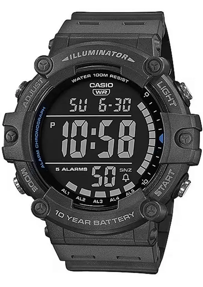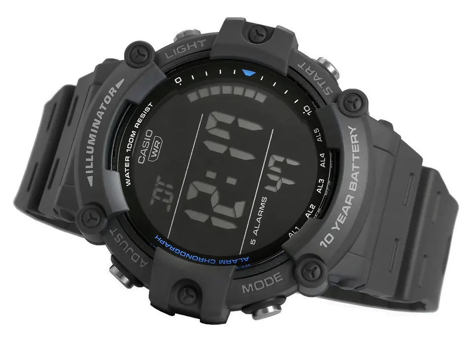 - Tarcza: Kwarcowa. Automatyczny kalendarz: rozbudowany datownik, który automatycznie dopasowuje datę w przypadku krótszych miesięcy; Timer: możliwość odliczania od zaprogramowanego czasu do zera; Zegar 12/24: możliwość wyświetlania godziny w trybach 12 i 24 godzinnych; Stoper: 1/100 mierzy czas do jednej setnej sekundy; Dual-Time: możliwość ustawienia drugiego niezależnego czasu; Alarm: zegarek może sygnałem dźwiękowym informować 5 razy w ciągu doby, w tym tryb drzemki oraz opcja sygnalizacji o pełnych godzinach; Iluminator: możliwość podświetlenia tarczy diodą LED, wytrzymałóśc baterii: 10 lat