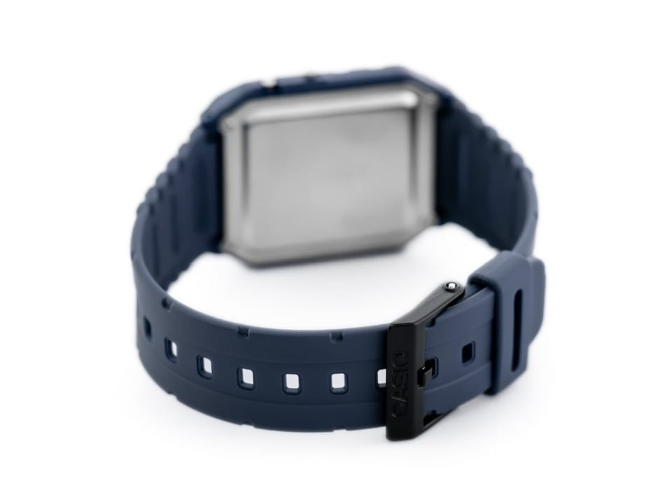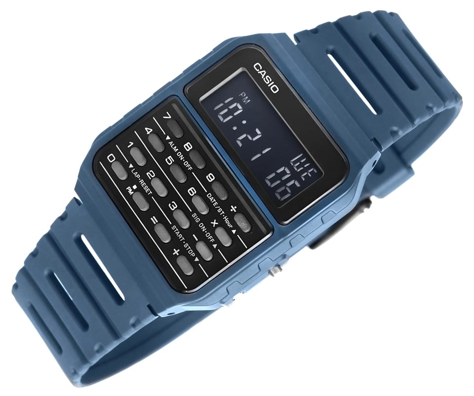 Tarcza zegarka jest czytelna, prosta i praktyczna, co idealnie pasuje do jego kultowego, minimalistycznego designu z lat 80.. Intuicyjne przyciski zapewniają łatwą obsługę, a ich rozmieszczenie pozwala na szybkie wprowadzanie danych. Niezależnie od tego, czy podliczasz wydatki, przeliczasz waluty czy robisz szybkie kalkulacje w pracy – ten zegarek z kalkulatorem zawsze masz pod ręką, gotowy do działania. Górna część ekranu wyświetla dodatkowe funkcje (dzień tygodnia, alarm, stoper), dolna pokazuje aktualny czas w formacie 12/24-godzinnym.