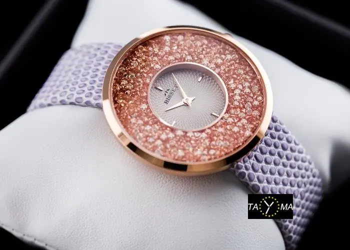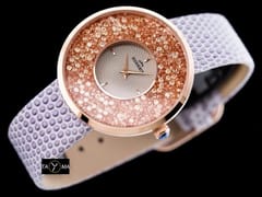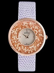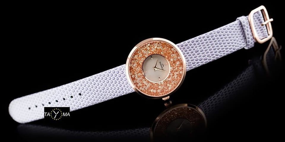 WYMIARY: koperta: 38 x 38 x 8,7mm tarcza: 34mm szerokość paska: 18mm długość całości: ok. 226mm Mechanizm: RONDA SWISS Koperta stalowa złocona metodą PVD Kolorystyka: Tarcza w kolorach srebrnym i rosegold zdobiona cyrkoniami, koperta w kolorze rosegold, pasek w kolorze biało-fioletowym Gwarancja producenta: 24m-ce
