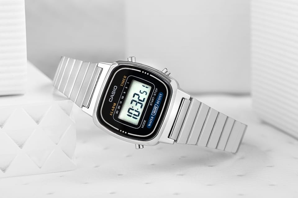 Cyfrowy zegarek dla miłośniczek mody, które cenią sobie indywidualny styl, jednocześnie pozostając na bieżąco z najnowszymi trendami. Jego delikatna, zaokrąglona koperta otoczona metalową bransoletą przywołuje na myśl klasykę lat 70., dodając nuty retro do każdej stylizacji. Dzięki wbudowanemu stoperowi, minutnikowi i alarmowi, ten zegarek to nie tylko ozdoba, ale i praktyczny dodatek dla kobiet ceniących funkcjonalność w pięknej oprawie. Jego delikatne przyciski dają poczucie kontroli nad czasem, a lekka konstrukcja sprawia, że niemal stapia się ze skórą, towarzysząc Ci w każdej chwili dnia.