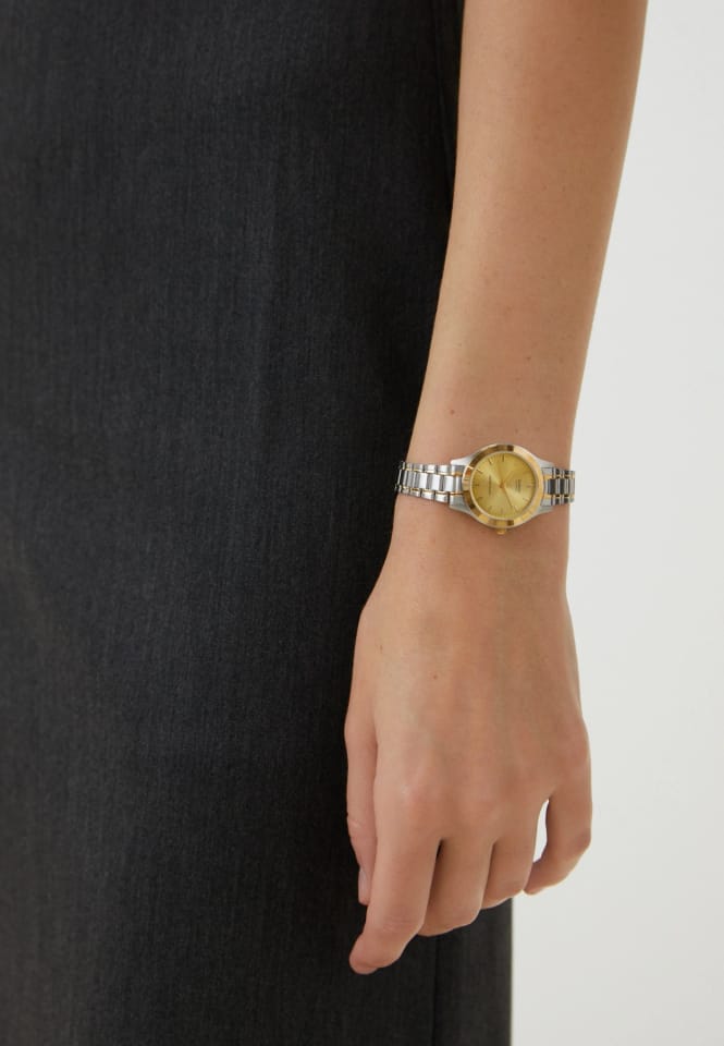 Wykonana z wysokiej jakości stali nierdzewnej, o podwójnym rodzaju wykończenia: matowym środku oraz szczotkowanych brzegach nadaje zegarkowi unikalny wygląd. Stal nierdzewna jest materiałem odpornym na uszkodzenia mechaniczne, co sprawia, że bransoleta dobrze znosi codzienne użytkowanie i zachowuje swój estetyczny wygląd przez długi czas. Zegarek jest wyposażony w specjalne zapięcie, które pozwala na regulację długości bransolety bez potrzeby usuwania ogniw. Bransoleta posiada solidne, zatrzaskowe zapięcie, które zapobiega przypadkowemu rozpięciu zegarka, co jest szczególnie ważne w sytuacjach aktywnych lub intensywniejszych ruchach ręki.