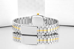 To eleganckie i praktyczne zapięcie motylkowe, które zapewnia bezpieczeństwo noszenia, umożliwia łatwe zakładanie i zdejmowanie zegarka oraz zachowuje smukły wygląd bransolety po zapięciu. Wielostopniowy mechanizm zapobiega przypadkowemu odpięciu zegarka, a całe zapięcie jest dyskretne i dobrze komponuje się z bransoletą.