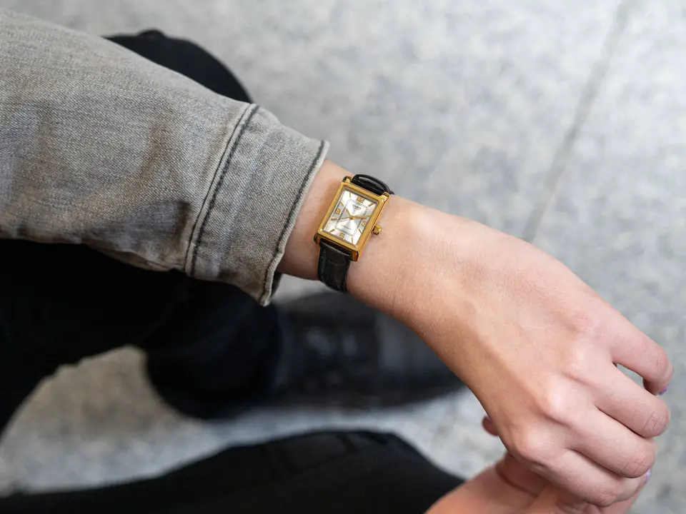 Srebrna, lśniąca tarcza z pionowymi indeksami i czytelnymi cyframi arabskimi sprawia, że odczyt godziny jest niezwykle prosty. Szkło mineralne, odporne na uderzenia, chroni cyferblat, utrzymując go w nienagannym stanie.