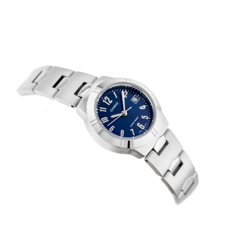 CASIO LTP-1241D-2A2 to elegancki zegarek damski, który łączy w sobie klasyczny design z nowoczesnymi rozwiązaniami technologicznymi. Zegarek charakteryzuje się stalową kopertą o średnicy 25 mm, która nadaje mu subtelny, ale jednocześnie wyrazisty wygląd. Koperta została wykonana z wysokiej jakości stali nierdzewnej, co zapewnia trwałość oraz odporność na uszkodzenia. Zegarek posiada granatową tarczę, na której umieszczono srebrzyste indeksy oraz wskazówki, co sprawia, że odczyt godziny jest wygodny i przejrzysty. Na tarczy znajduje się także datownik, który wyświetla aktualny dzień miesiąca. Dzięki zastosowaniu szkiełka mineralnego, tarcza jest odporna na zarysowania, co zapewnia długotrwałą estetykę zegarka. Bransoleta, również wykonana ze stali nierdzewnej, ma elegancki, srebrny kolor, który doskonale komponuje się z resztą designu. Jest wygodna i łatwa do dopasowania do nadgarstka, co sprawia, że zegarek jest komfortowy w noszeniu na co dzień. CASIO LTP-1241D-2A2 to zegarek, który łączy funkcjonalność z estetyką, oferując precyzyjny mechanizm kwarcowy oraz elegancki wygląd. To doskonały wybór dla osób poszukujących zegarka, który będzie pasował do zarówno codziennych, jak i bardziej formalnych stylizacji.