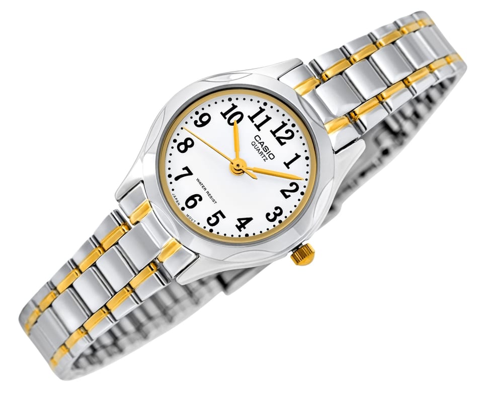 Śnieżnobiała tarcza z wyraźnymi, czarnymi cyframi to połączenie minimalizmu i elegancji, które sprawia, że zegarek jest niezwykle czytelny i funkcjonalny. Złote wskazówki oraz subtelne detale nadają mu szlachetnego charakteru, a lśniąca srebrno-złota bransoleta dodaje biżuteryjnego uroku, pięknie komponując się z każdym stylem. Smukła koperta, o subtelnie zaokrąglonych krawędziach, idealnie dopasowuje się do kobiecego nadgarstka, podkreślając jego delikatność i wdzięk. Każdy detal tego zegarka marki CASIO został zaprojektowany z myślą o kobiecej delikatności i klasycznym pięknie.