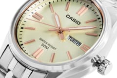 Damski zegarek CASIO LTP-1335D to harmonijne połączenie subtelności i nowoczesnej elegancji. Tarcza ma ciepły, złocisto-szampański odcień. To kolor subtelny, z klasą, o lekko satynowym połysku. Kojarzy się z elegancją i delikatnym luksusem – pasuje do ciepłych tonacji skóry, złotej biżuterii i stylizacji w odcieniach beżu, écru czy karmelu. Dyskretna funkcja datownika z dniem tygodnia troszczy się o Twoją codzienność, a wodoodporność do 50 (5 BAR) metrów sprawia, że możesz mieć go zawsze przy sobie – niezależnie od planów i pogody. To zegarek dla kobiety, która ceni jakość, lekkość i świadome wybory. Delikatny, ale pełen charakteru. Elegancki, ale nienachalny. Będzie doskonałym dopełnieniem białej koszuli, zwiewnej sukienki i ulubionych jeansów z wysokim stanem – bo to Ty nadajesz ton swojemu stylowi.
