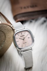 Model ten wyposażony jest w czytelną, różową tarczę, która kontrastuje z srebnymi indeksami i wskazówkami, co zapewnia wygodę odczytu godziny. Zegarek posiada funkcję datownika, a jego wodoszczelność na poziomie WR50 chroni przed przypadkowymi zachlapaniami, co czyni go praktycznym wyborem na co dzień.