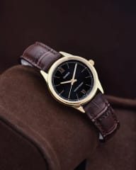 Złota koperta z eleganckim połyskiem doskonale komponuję się z brązowym paskiem wykonanym ze skóry naturalnej, nadając zegarkowi wyjątkowy charakter. Ten model doskonale sprawdzi się zarówno jako dodatek do codziennego stroju, jak i jako subtelny akcent w bardziej formalnych stylizacjach. Zegarek CASIO LTP-V005GL-1B2 to połączenie tradycji, precyzji i stylu, które podkreśli wyjątkowy gust każdej noszącej go kobiety.