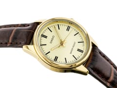 Złota koperta z eleganckim połyskiem doskonale komponuję się z brązowym paskiem wykonanym ze skóry naturalnej, nadając zegarkowi wyjątkowy charakter. Ten model doskonale sprawdzi się zarówno jako dodatek do codziennego stroju, jak i jako subtelny akcent w bardziej formalnych stylizacjach. Zegarek CASIO LTP-V005GL 9A to połączenie tradycji, precyzji i stylu, które podkreśli wyjątkowy gust każdej noszącej go kobiety.