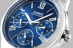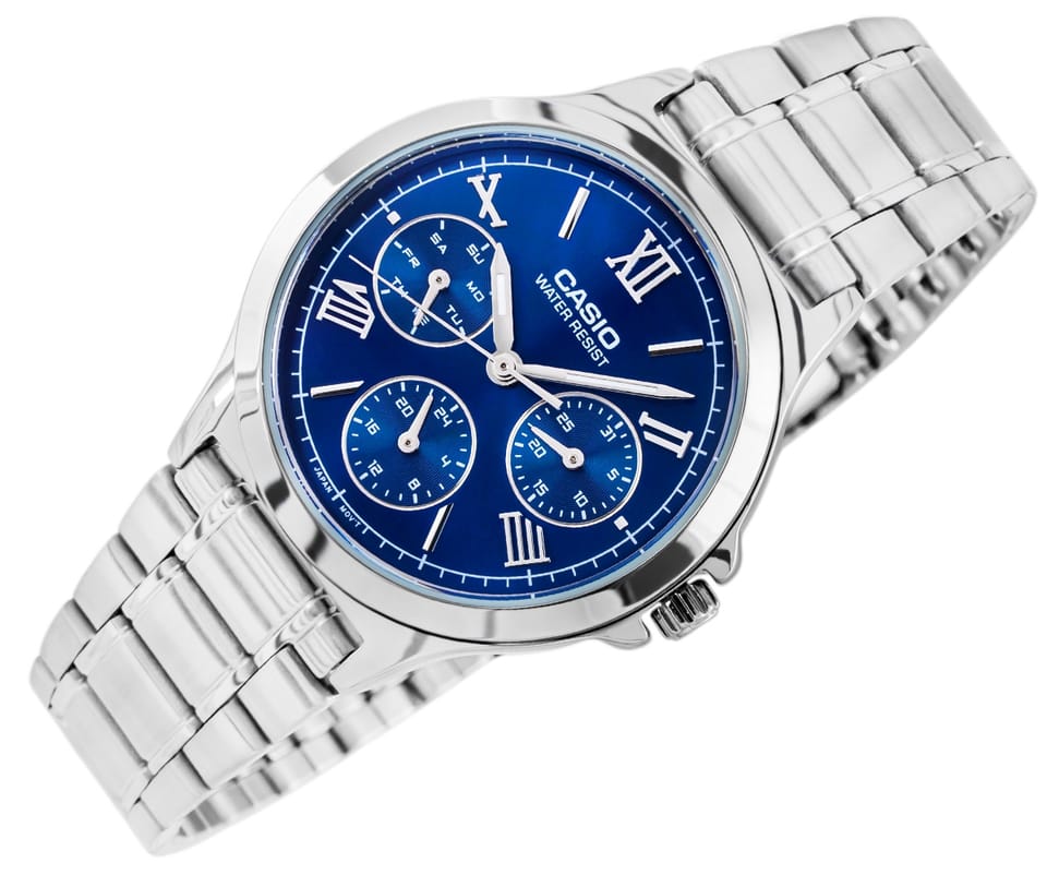 Ten zegarek CASIO to prawdziwa perła wśród damskich dodatków – hipnotyzuje głęboką, kobaltową tarczą, która w zależności od światła mieni się niczym tafla jeziora o zmierzchu. Delikatne rzymskie indeksy i smukłe wskazówki nadają mu klasy, a srebrna bransoleta z połyskiem subtelnie podkreśla kobiecy nadgarstek. Trzy małe tarcze dbają o codzienną organizację – pokazując dzień tygodnia, datę i czas 24-godzinny. To połączenie elegancji, funkcjonalności i zmysłowego uroku, stworzone dla kobiet, które kochają detale z charakterem.