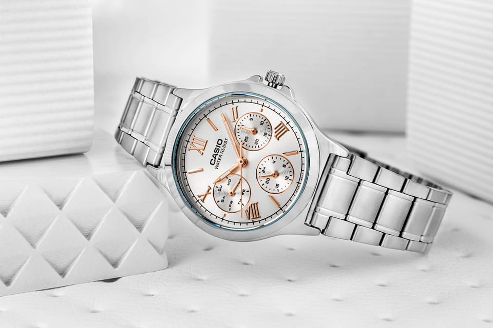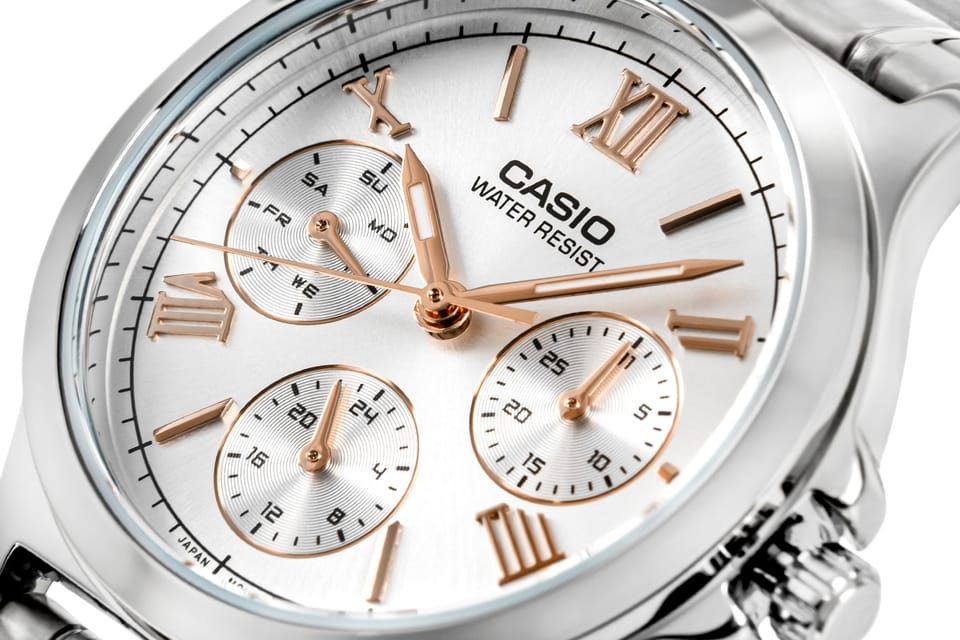 Zegarek CASIO to połączenie luksusowego wyglądu i codziennej funkcjonalności. Jego elegancka bransoleta i dopracowana tarcza z delikatnym połyskiem sprawiają, że przyciąga wzrok i doskonale komponuje się z kobiecymi stylizacjami. Trzy dodatkowe subtarcze wskazują dzień tygodnia, datę i czas 24-godzinny, dzięki czemu zawsze masz wszystko pod kontrolą. To zegarek, który nie tylko zdobi nadgarstek, ale też ułatwia organizację dnia. Idealny dla kobiet, które lubią styl i wygodę w jednym.