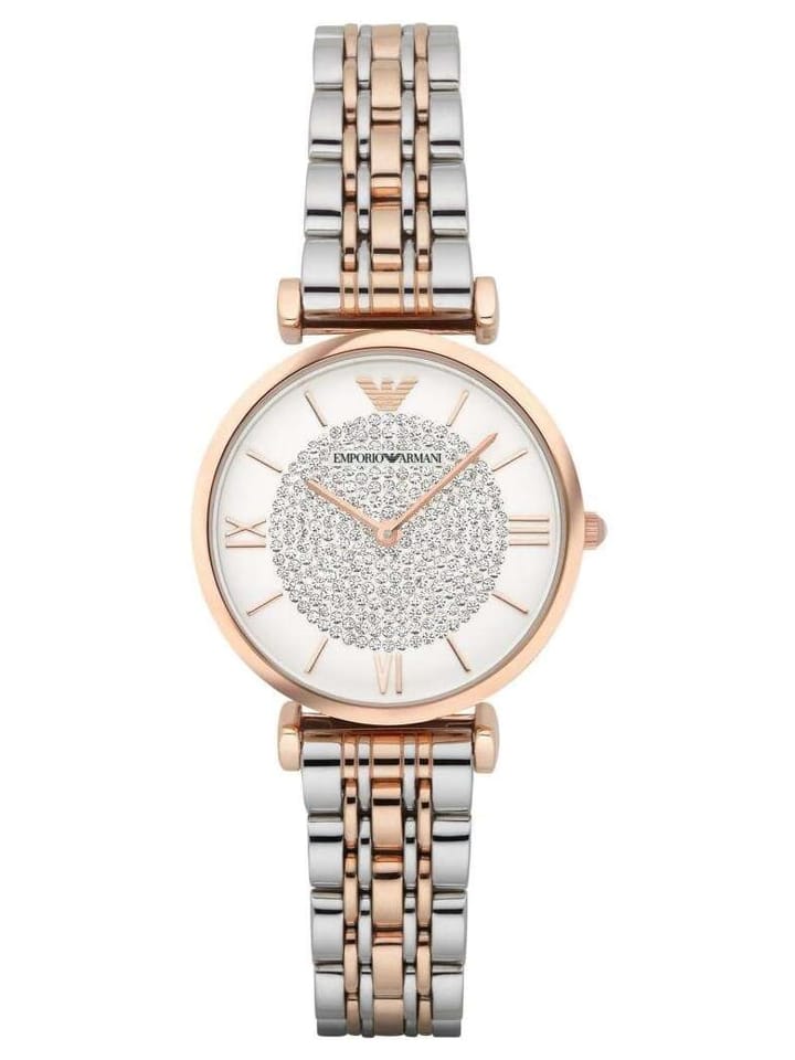 Damski zegarek Emporio Armani AR1926 z serii Gianni T-Bar to elegancki damski zegarek idealny na każdą okazję. Koperta oraz bransoleta zostały wykonane ze stali szlachetnej z powłoką PVD w kolorze różowego złota oraz srebra, co gwarantuje wieloletnią odporność na zniszczenie i odbarwienia. Model posiada dokładny mechanizm kwarcowy zasilany baterią. Biała tarczę zdobioną srebrnymi cyrkoniami zabezpiecza odporne na zarysowania szkło mineralne.