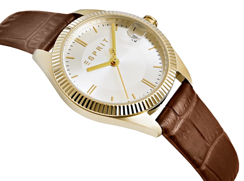 ESPRIT Madison to idealne połączenie klasyki i nowoczesnej elegancji. Jego tarcza w subtelnym odcieniu srebra rozświetla nadgarstek delikatnym, promienistym szlifem, który przyciąga spojrzenia. Finezyjnie zdobiona koperta w złotym odcieniu z subtelnie karbowanym bezelem nadaje mu wyjątkowej głębi i prestiżu. Pasek wykonany z wysokiej jakości skóry o subtelnym tłoczeniu, nawiązuje do tradycyjnego rzemiosła, jednocześnie zachowując nowoczesny charakter. Jego miękka struktura idealnie dopasowuje się do nadgarstka, zapewniając wygodę noszenia przez cały dzień. Ciepły odcień brązu harmonizuje ze złotą kopertą, tworząc wyrafinowaną kompozycję, która podkreśla styl i klasę.