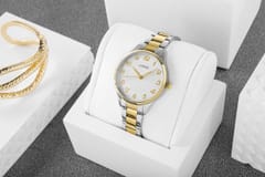 Delikatny efekt szczotkowanego metalu na tarczy tworzy promienisty wzór, który pięknie odbija światło, nadając mu wyjątkową głębię i efekt gry refleksów. Złote cyfry arabskie w eleganckim, lekko zakrzywionym kroju dodają mu kobiecego wdzięku i subtelnej wyrafinowanej estetyki. Wskazówki w kolorze złota harmonizują z detalami na tarczy, podkreślając prestiżowy charakter modelu. Dzięki tej wyjątkowej fakturze tarcza wygląda luksusowo i ponadczasowo, doskonale komponując się z bicolorową bransoletą.