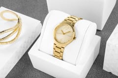 Tarcza utrzymana w ciepłym, złotym odcieniu, zachwyca delikatnym, promienistym wykończeniem, które pięknie odbija światło, dodając całości lekkości i blasku. Stylowe wskazówki w kształcie smukłych liści, precyzyjnie dopasowane do tarczy, płynnie przesuwają się po minimalistycznych indeksach, które delikatnie rozświetlają powierzchnię zegarka. Eleganckie, wypisane cyframi 12 i 6 w subtelnej, finezyjnej typografii podkreślają kobiecy charakter modelu. Drobne, złote punkty na godzinowych oznaczeniach dodają nuty biżuteryjnego uroku, sprawiając, że każdy rzut oka na tarczę staje się czystą przyjemnością.