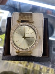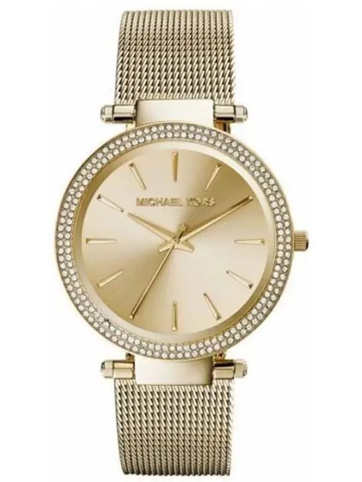 Model Michael Kors MK3368 to zegarek na stalowej bransolecie w kolorze złotym z kopertą ozdobioną cyrkoniami. Koperta chroni precyzyjny mechanizm kwarcowy, dzięki któremu zegarek dokładanie pokazuje aktualną godzinę.