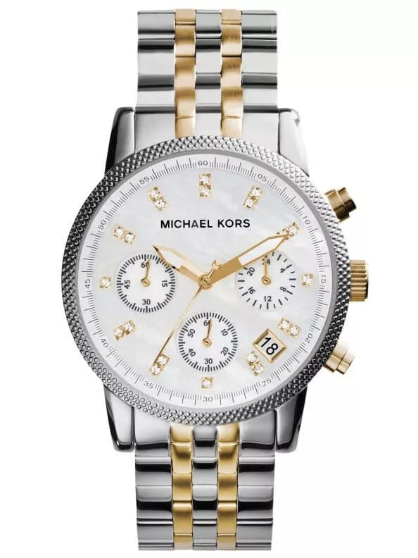 Zegarek Damski Michael Kors MK5057 - RITZ to stylowy, klasyczny model dla każdej kobiety. Zegarek ten został wykonany w całości ze stali szlachetnej w kolorze srebra i złota, co gwarantuje wieloletnią odporność na zniszczenie. Za niezawodne działanie urządzenia odpowiada dokładny mechanizm kwarcowy zasilany baterią.