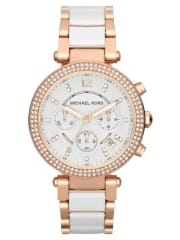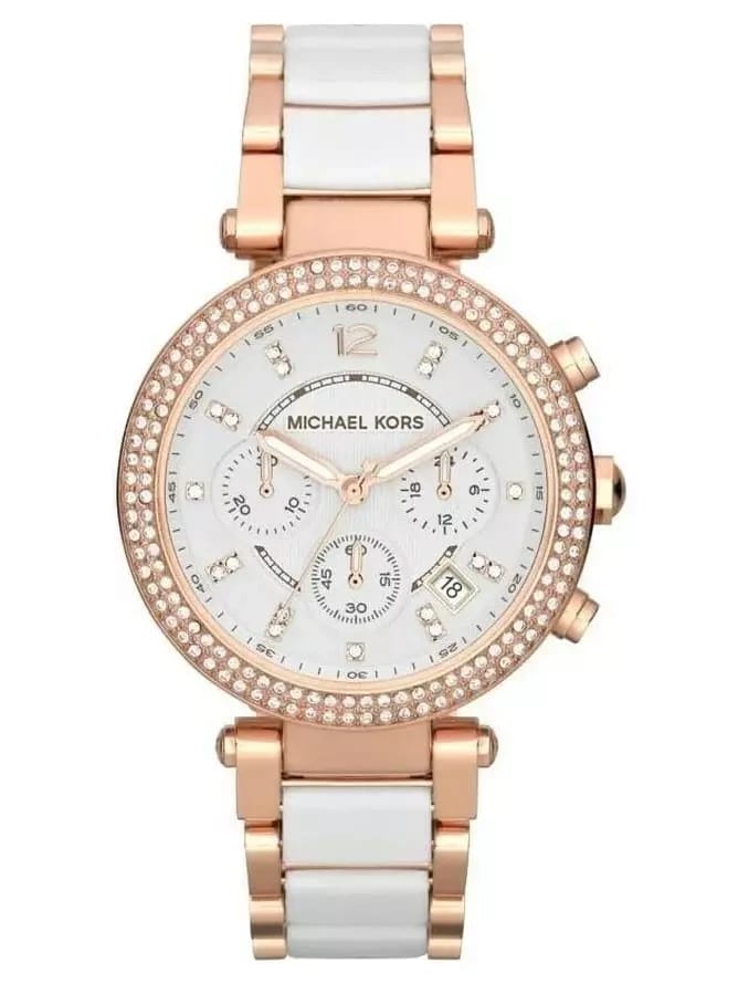 Zegarek damski Michael Kors MK5774 przeznaczony jest dla kobiet które cienią sobie wyróżniające się dodatki. Koperta zegarka MK5774 wykonana została ze stali szlachetnej w kolorze różowego złota zdobiona cyrkoniami. Tarcza w kolorze białym chroniona mineralnym szkiełkiem, na której znajduje sie chronograf odmierzający czas oraz datownik. Zegarek MK5774 został wyposażony w precyzyjny mechanizm kwarcowy.