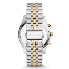 Model Michael Kors MK5955 z serii Lexington to stylowy damski zegarek o niebanalnej stylistyce, doskonały do eleganckiego ubioru. Zegarek posiada stalową, dwukolorową bransoletę. Wyposażony jest w precyzyjny mechanizm kwarcowy, dzięki któremu zegarek dokładanie pokazuje aktualną godzinę. Na tarczy zabezpieczonek mineralnym szkłem znajdziemy datownik wskazujący dzień miesiąca oraz 3 subtarcze będące wskazaniami chronografu oraz czasu dobowego.