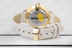 Koperta: złota Tarcza: biała Indeksy: złote, cyrkonie Wskazówki: złote, fluorescencja Sekundnik: złoty Pasek: beżowy