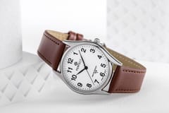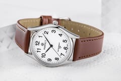Koperta: srebrna Tarcza: biała Indeksy: czarne Wskazówki: czarne Sekundnik: czarny Pasek: brązowy, nitka: brązowa