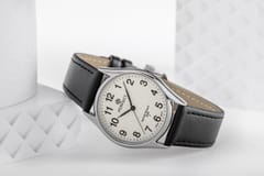 Ten zegarek to kwintesencja nowoczesnej elegancji, która zachwyca swoją minimalistyczną formą. Srebrna koperta harmonijnie łączy się ze srebrną tarczą, tworząc jednolitą i stylową całość. Czarne indeksy oraz wskazówki dodają wyrazistego kontrastu, sprawiając, że czas jest zawsze czytelny.