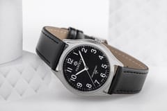 Ten zegarek to doskonałe połączenie nowoczesnej elegancji i klasycznej estetyki. Srebrna koperta otacza głęboką czarną tarczę, która emanuje tajemniczością i stylem. Białe indeksy oraz srebrne wskazówki tworzą efektowny kontrast, zapewniając doskonałą czytelność na pierwszy rzut oka, a srebrny sekundnik dodaje płynności i dynamiki.