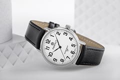 Ten zegarek to esencja nowoczesnej elegancji. Srebrna koperta subtelnie otacza białą tarczę, tworząc harmonijną całość. Czarne indeksy oraz wskazówki kontrastują z jasnym tłem, zapewniając doskonałą czytelność. Czarni sekundnik dodaje dynamiki, płynnie poruszając się w rytmie czasu.