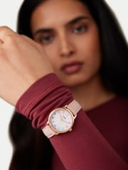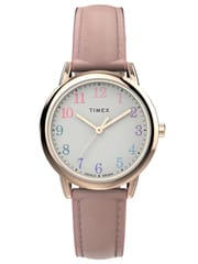 Elegancki damski zegarek TIMEX EASY READER TW2W32300 pasuje idealnie do codziennych stylizacji, jak i na bardziej uroczyste okazje. Tarcza w kolorze białym z czytelnymi wielokolorowymi cyframi - całość chroni mineralne szkło odporne na zarysowania. Model ten posiada różowy skórzany pasek oraz różowo złotą kopertę wykonaną z wysokiej jakości stali szlachetnej. Klasa wodoszczelności zegarka to WR30. Podświetlenie tarczy INDIGLO - Specjalny patent na podświetlenie tarczy. Po wciśnięciu koronki lub przycisku funkcyjnego tarcza zegarka zostanie podświetlona od spodu.