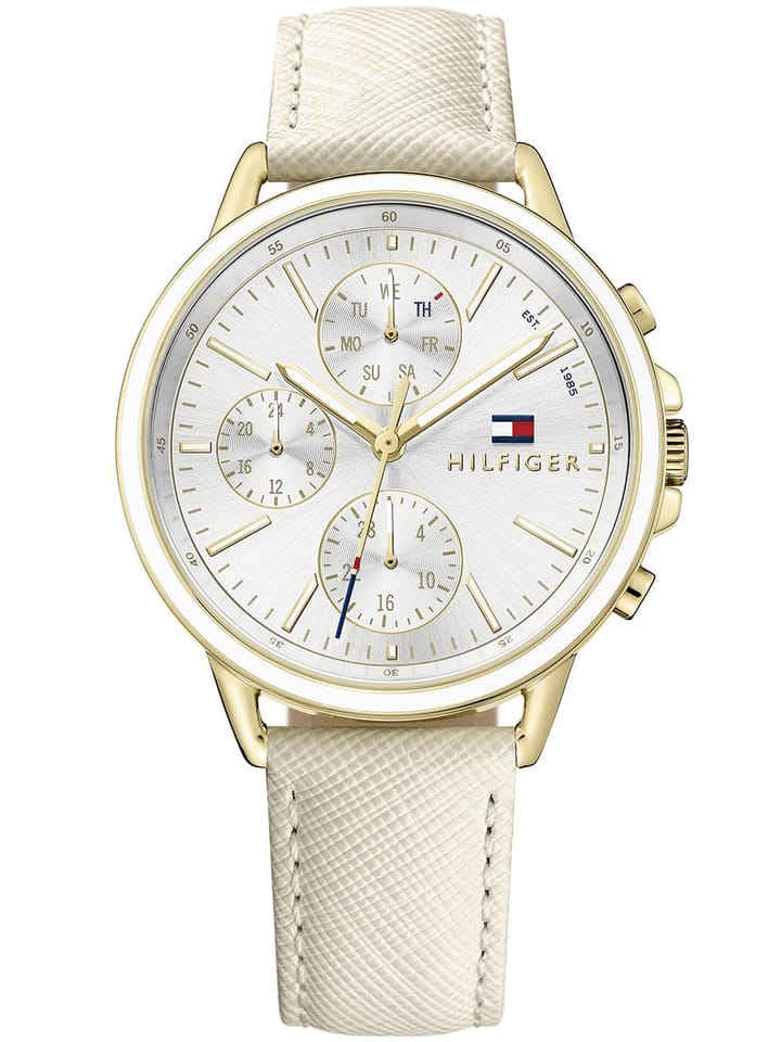 Zegarek Tommy Hilfiger Carly 1781790 to elegancki model stworzony z myślą o kobietach, które cenią styl i funkcjonalność. Jego biały skórzany pasek doskonale komponuje się z subtelną złotą kopertą, wykonaną z trwałej stali nierdzewnej. Szara tarcza, przykryta odpornym na zarysowania szkłem mineralnym, zapewnia łatwy odczyt godziny. Zegarek działa na precyzyjnym mechanizmie kwarcowym, który zasilany jest baterią. Dodatkowo, model wyposażony jest w funkcje datowników dni tygodnia i miesiąca, umieszczonych przy godzinach 12 i 6, oraz w tryb 24-godzinny, znajdujący się przy godzinie 9. Wodoszczelność na poziomie 30 metrów zapewnia ochronę przed wilgocią w przypadku lekkich zachlapań.