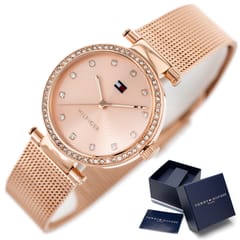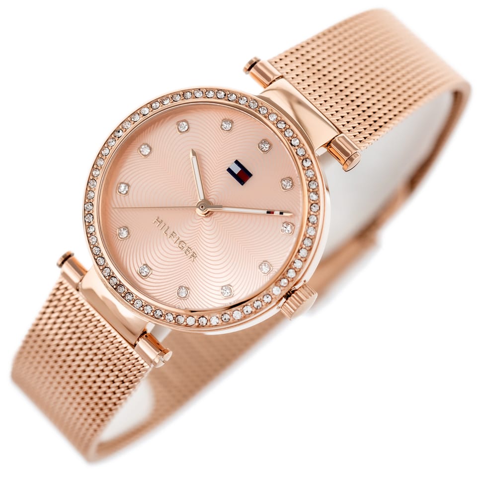 Zegarek Tommy Hilfiger 1781865 LYNN to wyjątkowa propozycja od kultowej już marki, będąca odzwierciedleniem najgorętszych trendów. Ten elegancki damski czasomierz zasilany niezawodnym kwarcowym mechanizmem. Koperta oraz bransoleta zostały wykonana ze stali szlachetnej, co gwarantuje jej wieloletnią odporność na zniszczenie. Całość jest utrzymana w kolorze różowego złota z dodatkiem cyrkonii na kopercie. Tarcza zegarka jest również w kolorze różowego złota z logo marki oraz indeksy zostały zastąpione cyrkoniami. Wodoszczelność rzędu 3 ATM.