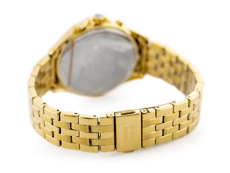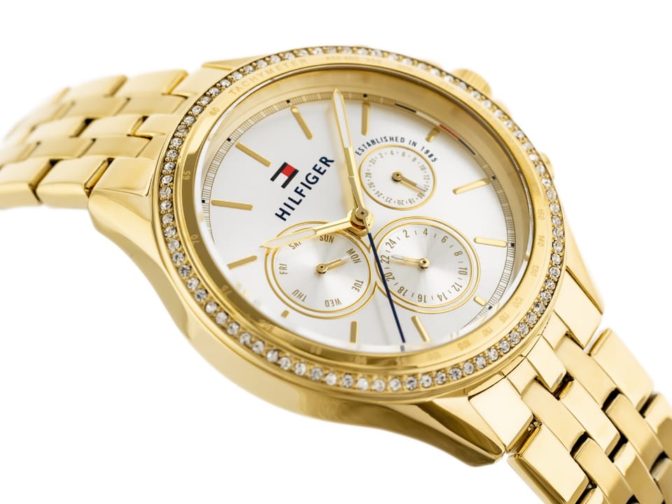 Zegarek damski Tommy Hilfiger Ari 1781977 to elegancki dodatek, który doskonale dopełni każdą kobiecą stylizację. Jego subtelna kolorystyka oraz staranne wykonanie sprawiają, że staje się wyjątkowym akcesorium. Złota koperta z wysokiej jakości stali szlachetnej, ozdobiona cyrkoniami, została połączona z bransoletą o podobnym wykończeniu. Tarcza w jasnym odcieniu jest dobrze widoczna, a mineralne szkło chroni ją przed uszkodzeniami. Zegarek posiada funkcje datownika oraz czasu 24-godzinnego, a jego niezawodny mechanizm kwarcowy działa na baterię. Wodoszczelność na poziomie 30 m zapewnia ochronę przed drobnymi zachlapaniami.