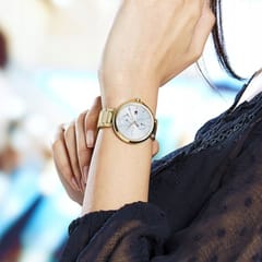 Na tarczy znajdziemy wskazania dnia miesiąca i tygodnia. Klasa wodoszczelności czasomierza to WR30, co gwarantuje szczelność zegarka w przypadku drobnych zachlapań.