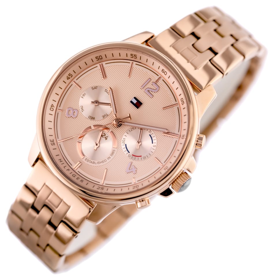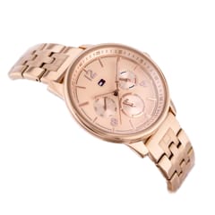 Zegarek damski Tommy Hilfiger Harper 1782224 to stylowa propozycja na co dzień, wyróżniająca się elegancką kolorystyką w odcieniach różowego złota. Koperta i bransoleta, wykonane z wysokiej jakości stali szlachetnej, świetnie komponują się z subtelną tarczą także w kolorze różowego złota, chronioną szkłem mineralnym. Tarcza wyposażona jest w funkcje datownika Day Date oraz wskaźnik czasu dobowego. Zegarek zasilany jest precyzyjnym mechanizmem kwarcowym, a jego wodoszczelność zapewnia ochronę przed drobnymi zachlapaniami.