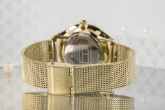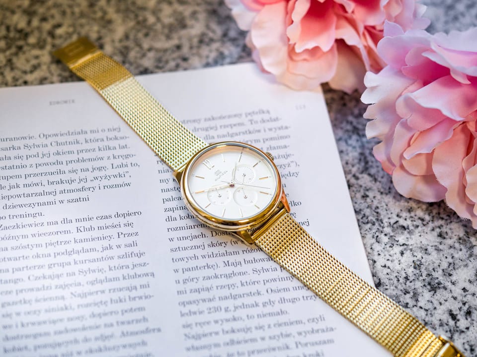 Olśniewający, złoty kolor zegarka mieni się jak promienie porannego słońca muskające skórę, budząc w noszącej go kobiecie subtelne poczucie luksusu. To zegarek, który nie tylko odmierza czas, ale zdaje się opowiadać historię o każdej godzinie i każdej minucie, jakby każdy drobny detal miał swoje własne, sekretnie zapisane znaczenie.