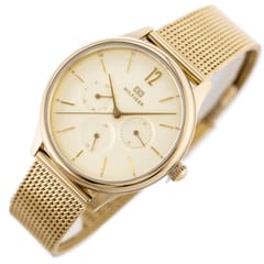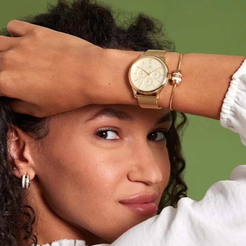 Elegancka siatkowa bransoleta, która oplata nadgarstek, zdaje się być lekka jak muśnięcie. Delikatność jej splotu przypomina misterną koronkę, lecz w złocie ma ona coś z greckiej bogini – elegancka i szlachetna, wyraża siłę i wytworność. Tarcza zegarka, jednolita, w złotym tonie, zdaje się lśnić spokojnym, łagodnym blaskiem. Zmysłowo rozmieszczone indeksy są tak delikatne, że przypominają pyłek unoszący się na złotym tle, gotowe do dotyku, lecz niemal ulotne. Cyfra „12” na szczycie – większa, bardziej wyrazista – w tym delikatnym złotym świecie wydaje się pełnić rolę przewodniczki, wskazując początek każdej nowej godziny z pewnością siebie. Wyważona kompozycja trzech mniejszych tarcz dodaje zegarkowi charakteru, pozostawiając jednak przestrzeń dla wyobraźni.