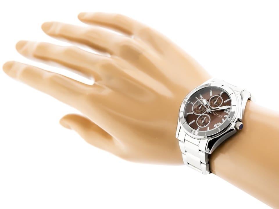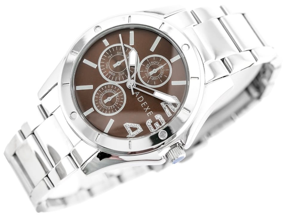 WYMIARY:koperta: 40 x 48mmśrednica tarczy: 32mmszerokość bransolety: 22mmobwód maksymalny: 190mm Kolorystyka: Tarcza brązowa, bransoleta srebrna, koperta srebrna