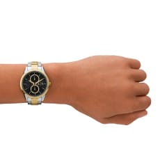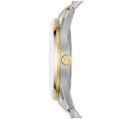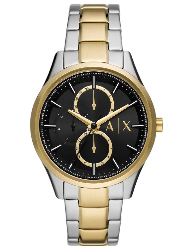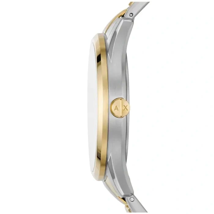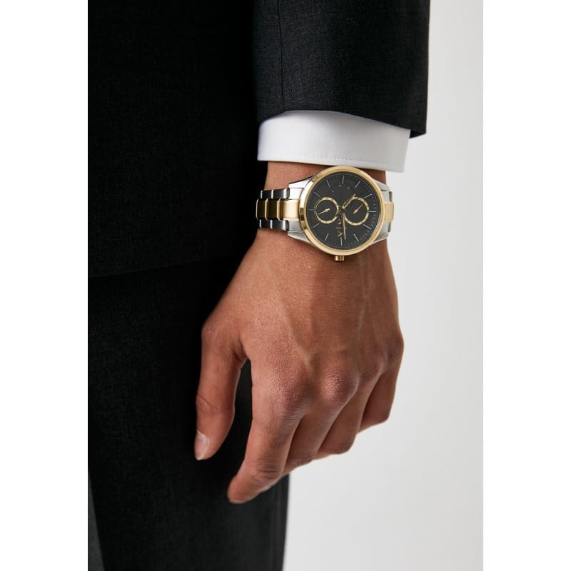 Zegarek Armani Exchange Dante AX1865 to elegancki model, który wyróżnia się minimalistycznym, ale nowoczesnym designem. Koperta o szerokości 42 mm, wykonana z wysokiej jakości stali szlachetnej, jest utrzymana w srebrno złotym kolorze, co nadaje zegarkowi elegancki, ponadczasowy wygląd. Czarnej tarczy towarzyszą złote indeksy i wskazówki, które subtelnie podkreślają jej styl. Zegarek wyposażono w bransoletę wykonaną również ze stali szlachetnej, co zapewnia wygodę i trwałość.