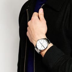 Zegarek męski Armani Exchange AX2177 to elegancki i nowoczesny model, który doskonale dopełni męską garderobę. Klasyczna srebrno biała kolorystyka sprawia, że zegarek pasuje zarówno do codziennych, jak i bardziej formalnych stylizacji. Koperta o szerokości 46 mm, wykonana z wysokiej jakości stali szlachetnej, jest połączona ze srebrną stalową bransoletą, co zapewnia trwałość oraz wygodę noszenia. Biała tarcza z efektem sunray posiada subtelne srebrne indeksy, co dodaje zegarkowi eleganckiego akcentu. Zegarek działa na precyzyjnym mechanizmie kwarcowym, a mineralne szkiełko chroni tarczę przed zarysowaniami. Wodoszczelność do 50 metrów sprawia, że jest odporny na zachlapania i codzienny kontakt z wodą.