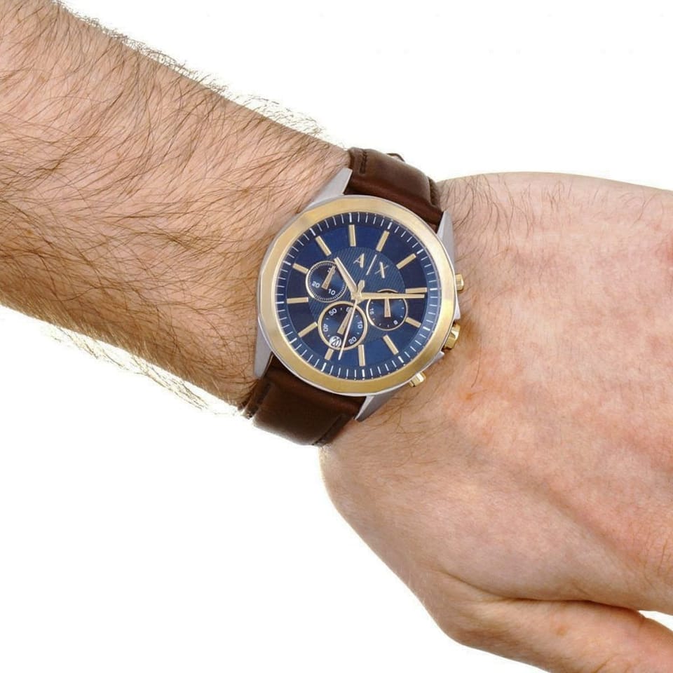 Zegarek męski Armani Exchange Drexler Chronograph AX2612 to model, który łączy nowoczesny wygląd z funkcjonalnością. Jego elegancka granatowa tarcza, chroniona przez mineralne szkło, stanowi piękny kontrast z srebrno złotą stalową kopertą. Koperta wykonana z wysokiej jakości stali szlachetnej, co nadaje zegarkowi solidny, ale lekki wygląd, odpowiedni na co dzień, jak i na specjalne okazje. Zegarek jest napędzany kwarcowym mechanizmem, zapewniającym precyzyjne odmierzanie czasu.