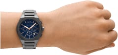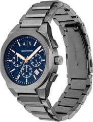 Zegarek męski Armani Exchange Rafael AX4182 wyróżnia się elegancką i stonowaną kolorystyką, która idealnie pasuje do różnych stylizacji. Granatowa tarcza w połączeniu z grafitową kopertą i bransoletą ze stali szlachetnej tworzy kontrast, który przyciąga wzrok, a jednocześnie pozostaje subtelny i klasyczny. Różowo złote akcenty na tarczy, w tym indeksy i wskazówki, doskonale komponują się z tłem, podkreślając nowoczesny charakter zegarka. Kolorystyka tego modelu sprawia, że jest to zegarek odpowiedni zarówno do codziennego użytku, jak i na bardziej formalne okazje, pasujący do szerokiego zakresu męskiej garderoby. Jego stonowana paleta barw nadaje mu elegancji, nie przytłaczając innych elementów ubioru.